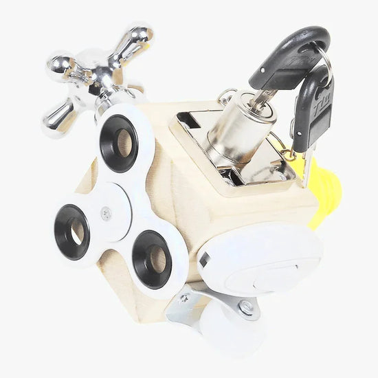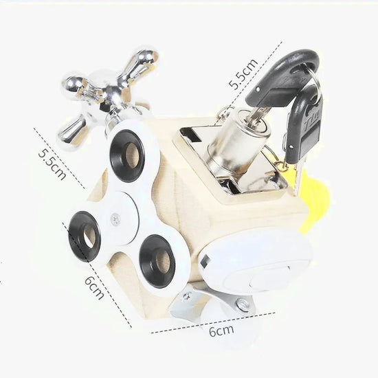 The Montessori sensory awakening cube is not only a toy, it is an invitation to adventure for each child. Each facet of this cube contains secrets and mechanisms designed to prick the natural curiosity of toddlers. By exploring each element, the child discovers not only how objects work, but also how the world around him works.