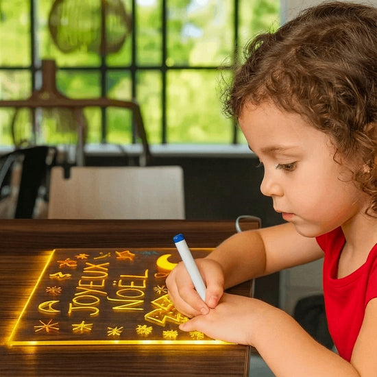 Offrez à votre enfant un moment de magie, de calme et de créativité avec la tablette lumineuse. Inspirée des besoins des parents modernes et des grands-parents bienveillants, elle transforme chaque dessin en chef-d’œuvre lumineux grâce à un éclairage LED captivant. Fournie avec 7 feutres lumineux, 2 chiffons de nettoyage et un support de dessin pratique, elle est facile à utiliser et se nettoie en un clin d’œil. Sans écran, sans plastique superflu et réutilisable à l’infini, la MagicBoard favorise l’autonomie, développe la motricité fine et apaise l’enfant. Un outil éducatif et durable, idéal pour créer des moments de calme et d’éveil… en toute simplicité.